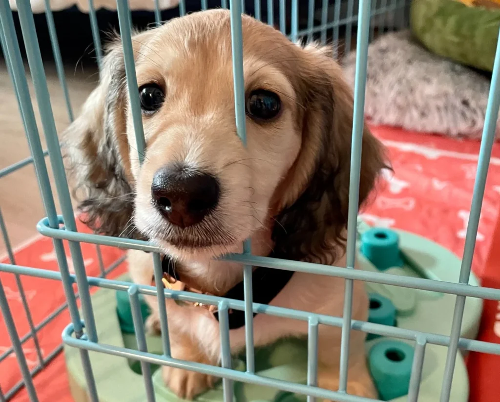Don’t close the door right away. Instead, spend short sessions with your dog inside the crate, gradually increasing the time they stay there.