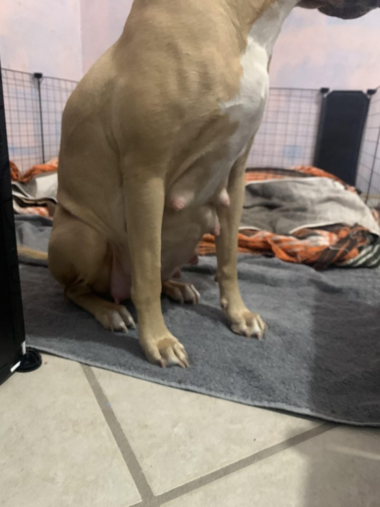 Milk may leak or drip from her nipples. This is a clear sign that puppies will arrive soon.